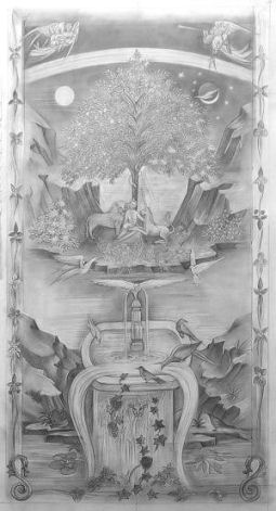 Unicorn A lunar, feminine symbol, with the lion as the male; chastity , purity, virginity, perfect good, virtue, and strength of mind and body; incorruptibility. Unicorns are sometimes depicted on either side of the tree of Life as guardians. The conflict between the lion and the unicorn represents solar and lunar powers and the pairs of opposites. Lion As a solar symbol it represents; masculinity, the heat of the sun, the splendour and power of the noon sun. The fire principle, majesty and strength. They can also be seen as guardians of the Tree of Life and represent vigilance and courage. The symbolic representation of the lion and the unicorn are also underpinned by the presence of the sun and the moon. Lamb, Gentleness, young innocence, meekness, purity, the unblemished. The lamb with the lion depicts the paradisal state. The Serpent When associated with the Tree of Life, its aspect is beneficent. Angels Messengers of God, a link between heaven and this world. The word comes from Angelos which means messenger. Symbols include: flaming swords, trumpets, sceptres, musical instruments, lilies. The Firmament The firmament divides the upper or celestial from the lower or terrestrial waters. The Hebrew word means something beaten or hammered out, it could also be imagined as a great vault of crystal to which the fixed stars were attached. The Fountain representing a source of the water of life that gushes freely forth nourishing the earth. Symbol of waters of life, immortality and eternal youth The Tree The tree of life and the tree of knowledge grow in Paradise. , the tree of life is at the centre and signifies regeneration, the return to the primordial state of perfection. the tree of life, which bare twelve [manner of] fruits, [and] yielded her fruit every month: and the leaves of the tree [were] for the healing of the nations. Rev 22:2 The Birds Linking Paradise with our world. Birds can represent the human desire to escape from gravity and the laws of this physical world, to reach the level of the angel. Border Violets, dogwood and strawberries, at the base water-plants and fish. The symbol of the bee was important to the commissioner and several are included. Other Symbols Wheat and Grapes are traditional Medieval symbols. Fish and a frog on the lily pad, a robin and a kingfisher. Lily of the valley, strawberries and violets. The two Dragons at the base are representations from the staircase feature within the house. Flowers and Blossom both symbols of young life and may represent spring and the fragile nature of childhood. The flower is often a symbol of beauty and the colour adds to the symbolic meaning, red is love and passion, white is innocence. Technique