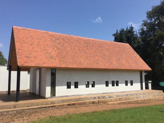 The roof for the cathedral has this outer layer of terra-cotta tiles from Kenya Clay. It was felt that the tiles should not be left simply in this natural state, so we created a design based on cutting the tiles.