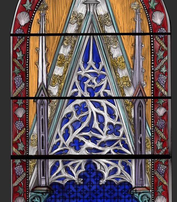 The support bars have been indicated, these should probably be bronze or treated stainless steel. The panels will be attached to these using copper wire soldered on to the panels. In keeping with the other windows in the building, these support bars will be fitted externally.