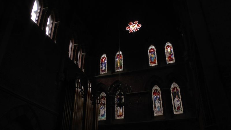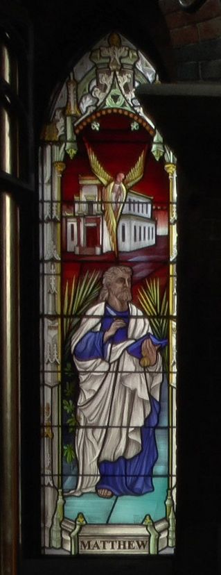 There is also an interesting situation in the placing of the windows. Although I have placed them in the standard order of Matthew Mark Luke and John, the Mark window is situated below the St Peter window. Mark was said to have been the scribe of St. Peter. and similarly, St Luke travelled widely with St Paul and he is located directly beneath the St. Paul Window.
