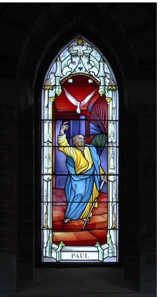 The St. Paul window shows Paul preaching. In his hand he holds the sword of his martyrdom.