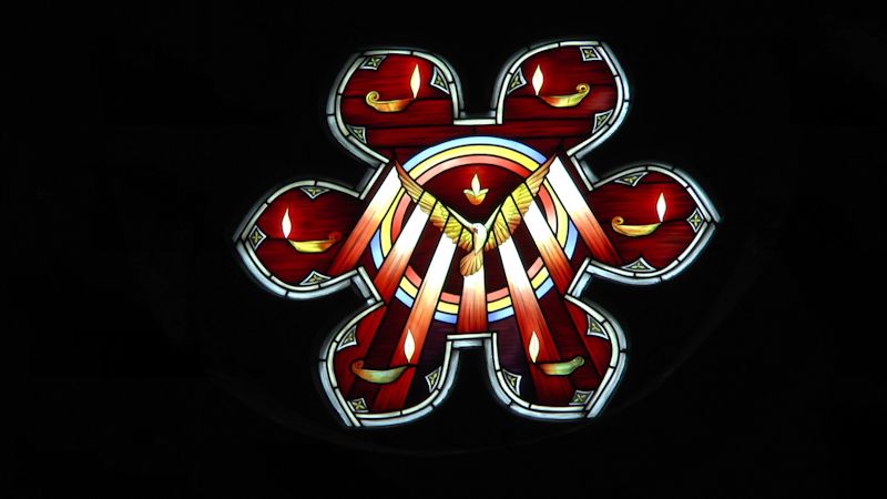 The theme of the Rose window is the Holy Spirit surrounded by 7 lamps representing the 7 gifts of the Holy Spirit. I have tried to find some way of developing the idea further symbolically, but apart from creating different representations of light within some of the petals of the rose, the design seems complete to me.