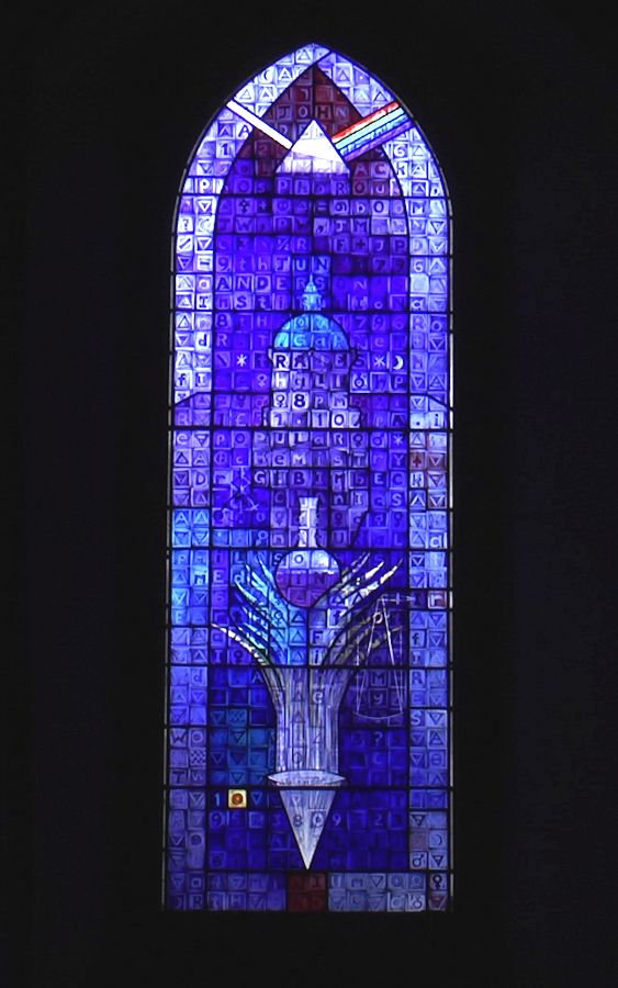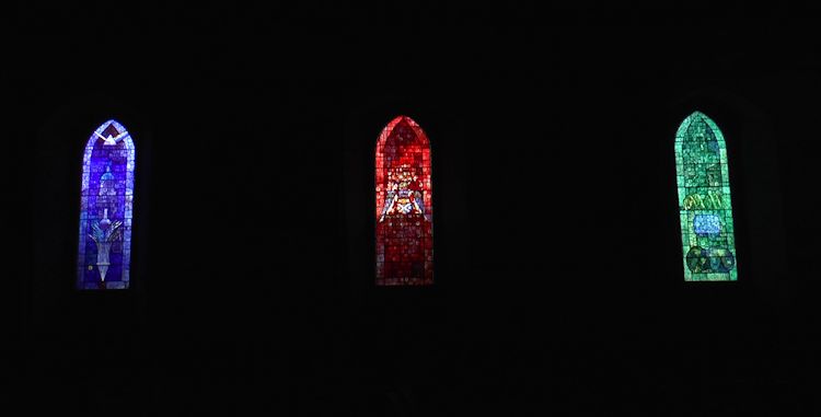 The three windows are predominantly blue, red and green, the three primary colours of light.