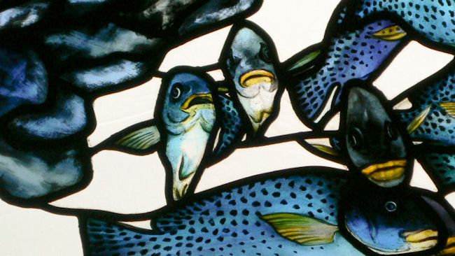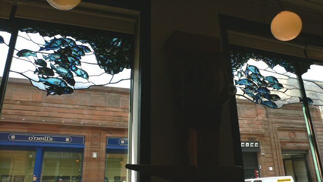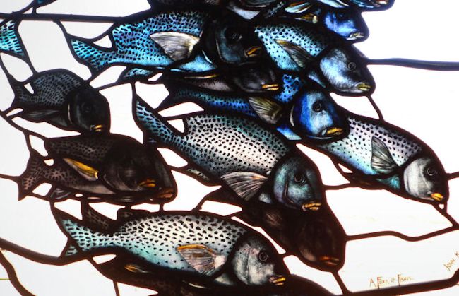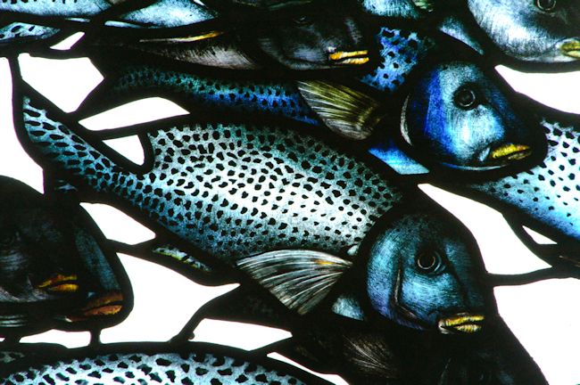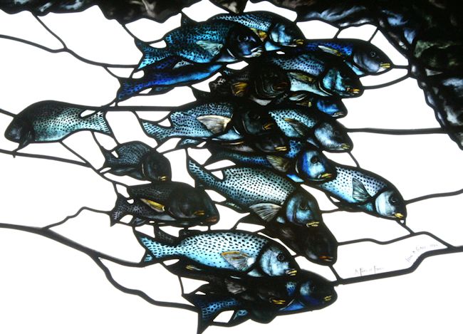 The window was commissioned by Iain Mackenzie, the owner of the cafe at the time. Having decided that something slightly unexpected would probably be best, the idea of using fish evolved through a couple of throw-away remarks.
