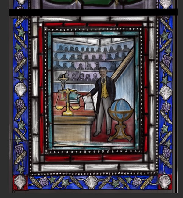 In my discussions with those involved with, what was now, the competition, I got the string impression that a similar approach to the works present would be appropriate. However, there seemed to be a wish to exemplify some aspect of the life of the subject. I felt that it would not be in keeping with the pattern of the existing windows to create a scene within the main body of the