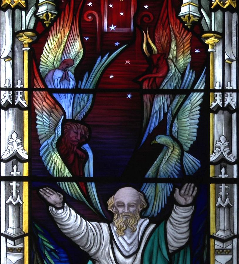 St. John is seen on an island representing Patmos, where he was exiled and is reputed to have written the book of revelation.