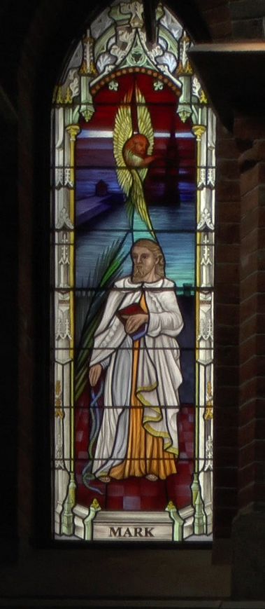 There is also an interesting situation in the placing of the windows. Although I have placed them in the standard order of Matthew Mark Luke and John, the Mark window is situated below the St Peter window. Mark was said to have been the scribe of St. Peter. and similarly, St Luke travelled widely with St Paul and he is located directly beneath the St. Paul Window.