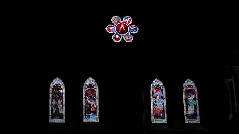 the upper row of four windows contain the figures of St. Mary, St. Peter, St. Paul and St. Stephen.