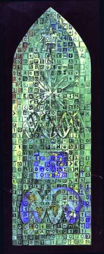 At the base the majority of the squares are filled with 0 and 1, the binary system representing all things digital, the first line, QWERTY of a typewriter or computer keyboard and the f1, f2, f3, etc. function keys,